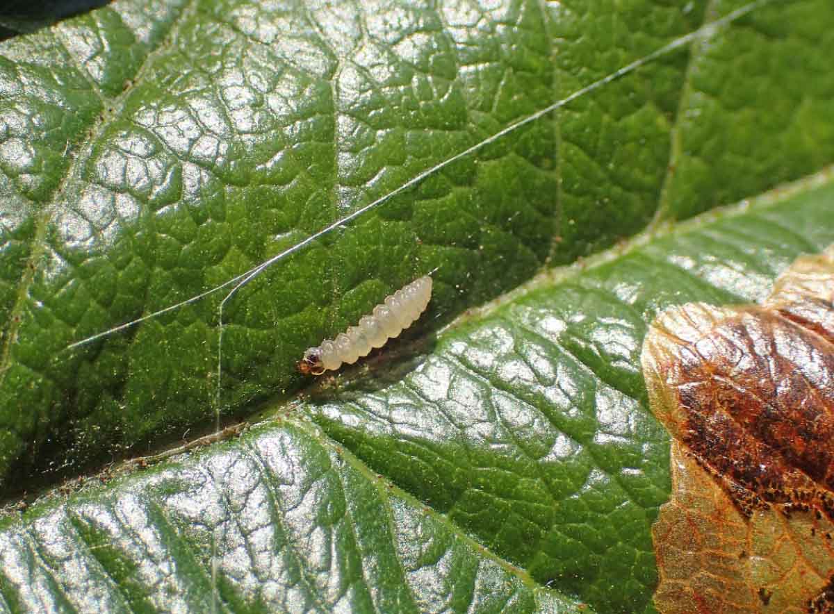 Podkopníček spirálový: zápředky na listu (v blízkosti zápředků se nachází larva zlatoočky - potenciální predátor housenek)