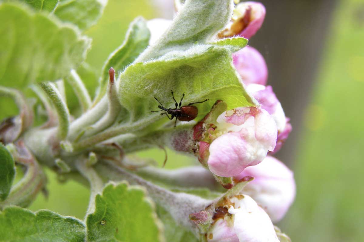 Nálet zobonosek do sadů překlenuje dlouhé období - brouci aktivně působí škody od myšího ouška až do BBCH 73–74