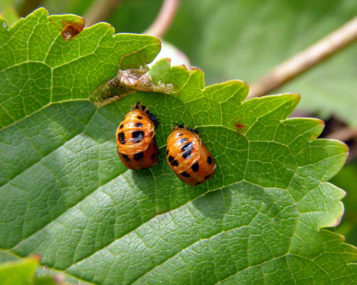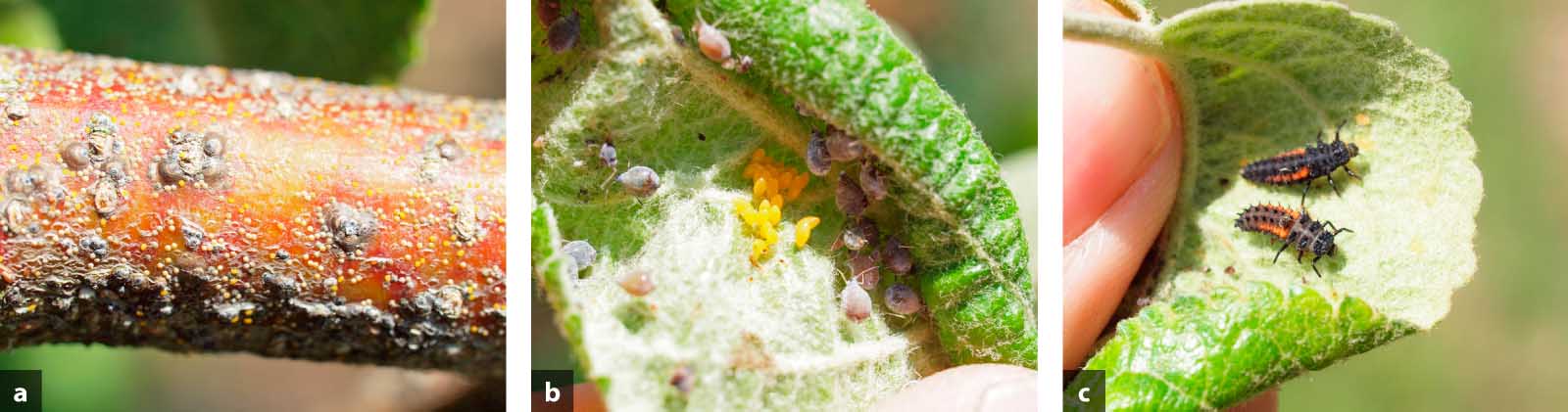 Kosterní větev napadená štítenkou zhoubnou s patrnými drobnými žlutooranžovými L1 nymfami - a; dominantním afidofágem je v posledních letech slunéčko východní: vajíčka v blízkosti kolonie mšice jitrocelové - b, larvy - c