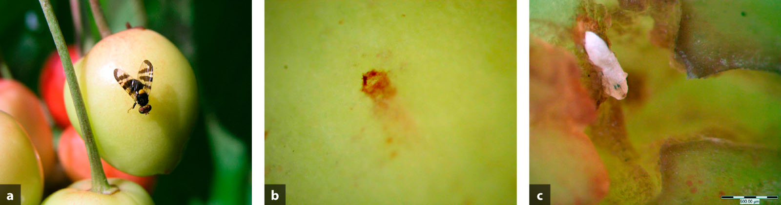 Vrtule třešňová: a - dospělec, b - vpich na plodu, c - vajíčko ve fázi dvou černých skvrn