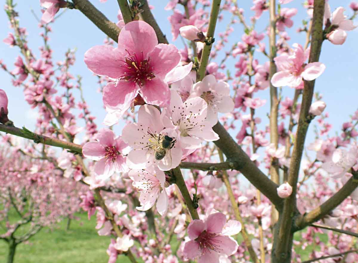 Během měsíce dubna pravidelně rozkvétají peckoviny - jako první zpravidla meruňky a poté broskvoně; s květem jsou také aktivní opylovači