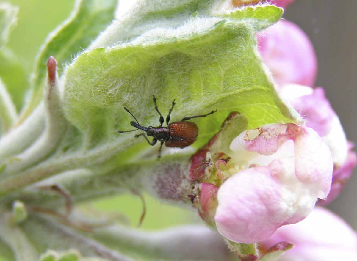 Dosavadní průběh letošní zimy i počátku března naznačuje, že nástup jara by mohly být oproti loňsku i předloňsku pomalejší. To znamená, že nadále bude aktuální ochrana proti květopasu jabloňovému (Anthonomus pomorum). Brouci bývají nejvíce aktivní od fáze BBCH 52 do 54, kdy samice prodělávají úživný žíra a posléze kladou. Hlavním vodítkem pro určení termínu zásahu je sklepávání, které provádíme přednostně za slunných teplejších dnů, kdy většina brouků opouští úkryty. V rozhodování nám pomohou i teplotní sumy, jež pro adulticidní ošetření činí SET10h = 250–300 °C. Ideální je však provést aplikaci bezprostředně po zjištění výsledku sklepávání, kdy máme aktuální údaj o výskytu květopasů, a tím pádem jsme schopni zasáhnout většinu populace. S volbou přípravků se nyní dostáváme do poměrně svízelné situace, neboť z trhu byly staženy přípravky s účinnými látkami thiacloprid a chlorpyriphos-methyl. Z povolených látek momentálně zůstává ve hře pouze spinosad, což do budoucna není ideální stav. Pracuje se proto na registraci přírodního pyrethra; některé studie poukazují na potenciální účinnost látek chlorantraniliprole a cyantraniliprole, určených nyní ovšem k jiným účelům. Všechny zmíněné alternativy včetně přírodního pyrethra by mohly opět otevřít cestu ke zvládání ochrany proti květopasům v režimu integrované produkce.