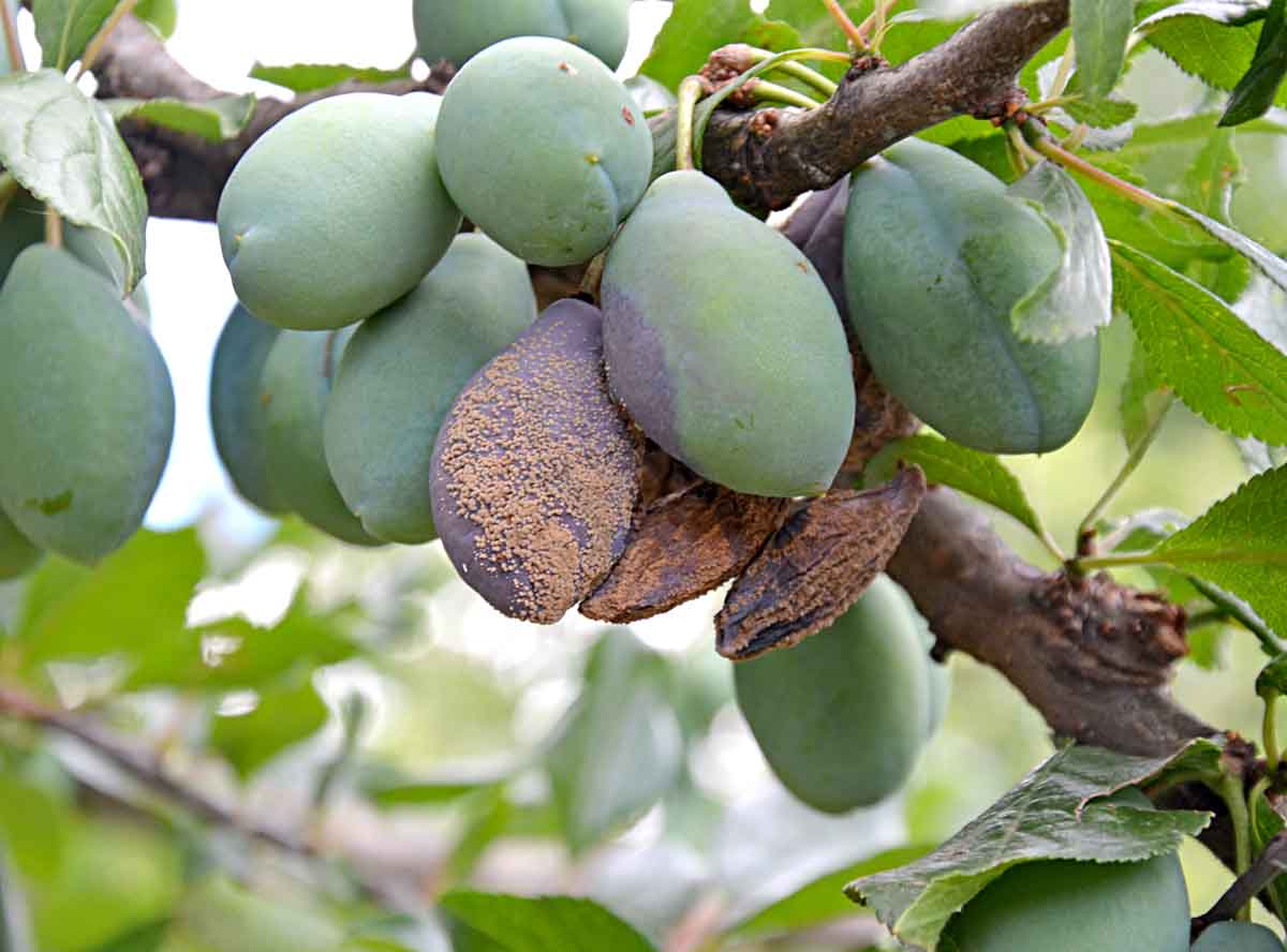Moniliniová hniloba slivoní - béžová sporodochia původce Monilinia fructigena