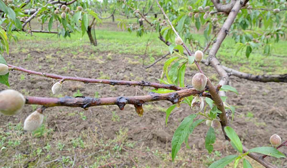Odumírání pupenů broskvoně - odumřelé pupeny a silný klejotok