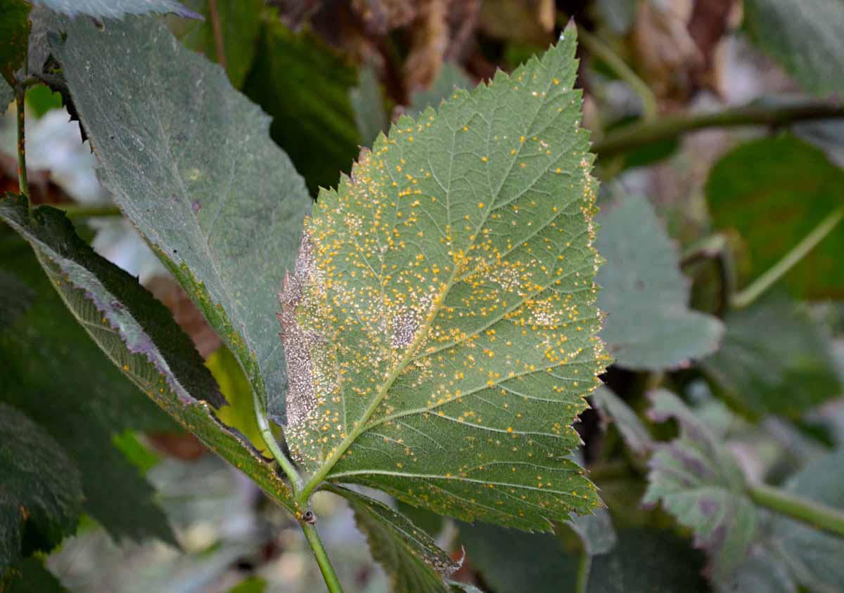 Žlutá rzivost ostružiníku - žlutá uredia a bělavá telia na spodní straně listu
