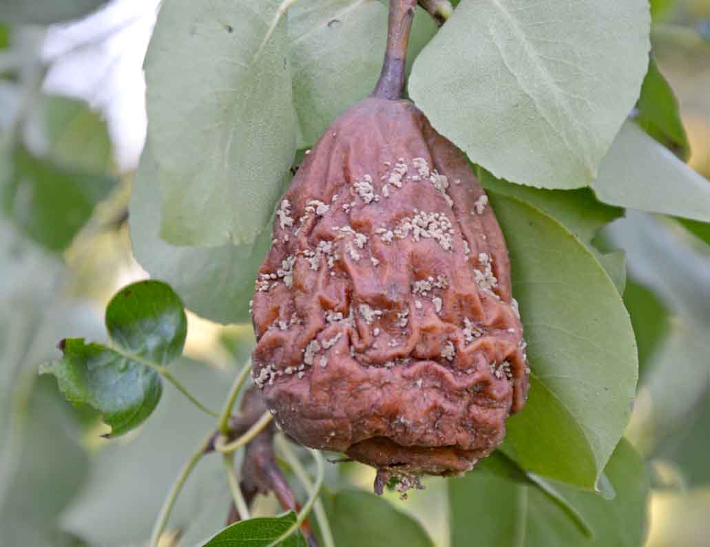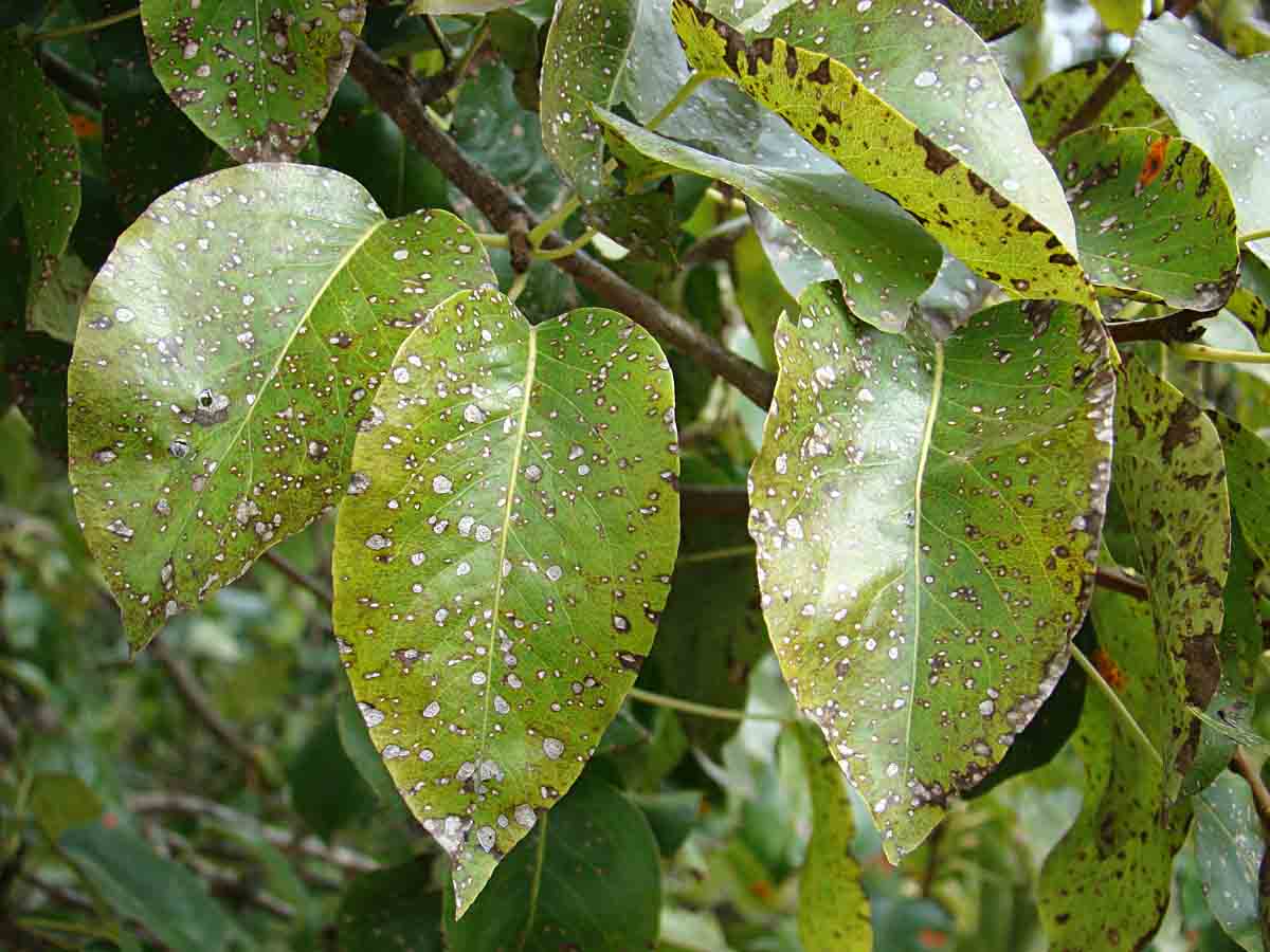 Po vydatných dešťových srážkách v červnu byly pozorovány silnější výskyty šedé skvrnitosti listů hrušně (Mycosphaerella pyri). K dalšímu šíření choroby docházelo v průběhu července i srpna. Především u náchylných odrůd došlo k předčasnému zaschnutí a opadu silně napadených listů.