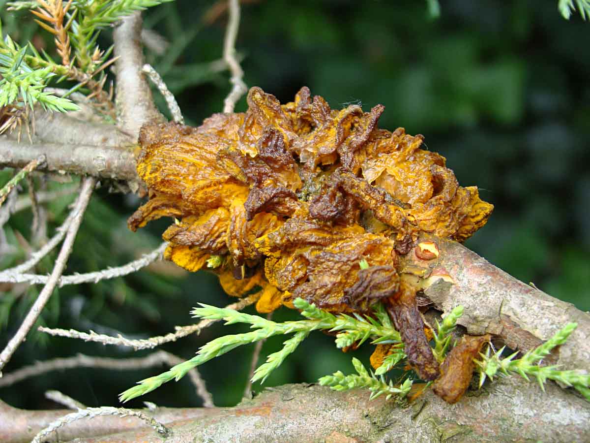 Rzivost hrušně - sloupcovitá rosolovitá telia na větévce hostitelského jalovce
