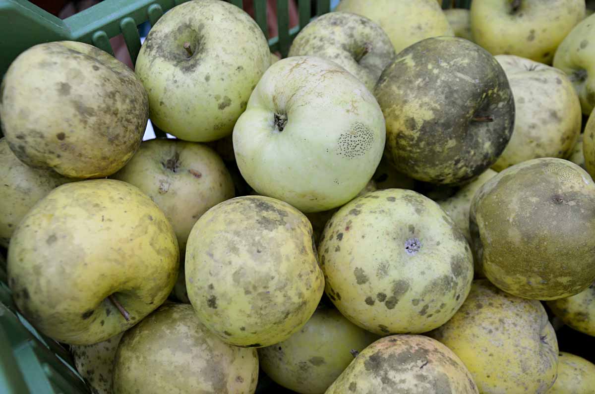Sazovitost jablek (cv. Sirius); na plodu uprostřed mušinovitost jablek