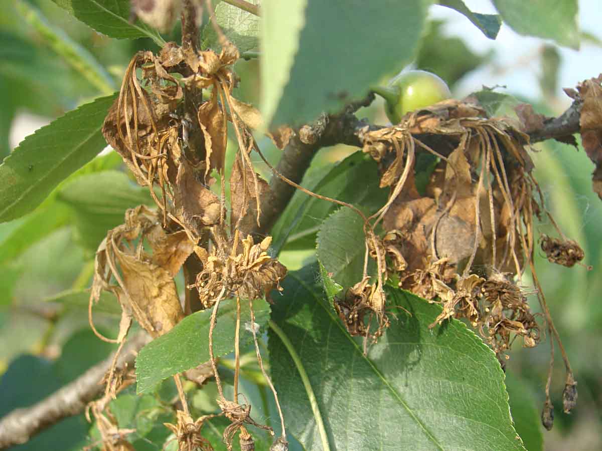 Odlišná byla situace, pokud jde o výskyt moniliniové spály višně (Monilinia laxa). Višně kvetly později až ve 2. dekádě dubna, kdy byly opakovaně krátká chladná období s ojedinělými dešti, což vytvořilo vhodné podmínky pro patogen. Lokálně došlo především u náchylných odrůd (např. Erdi Bötörmö, Morela pozdní) k silnému napadení a zaschnutí převážné části květů i k zasýchání větévek.