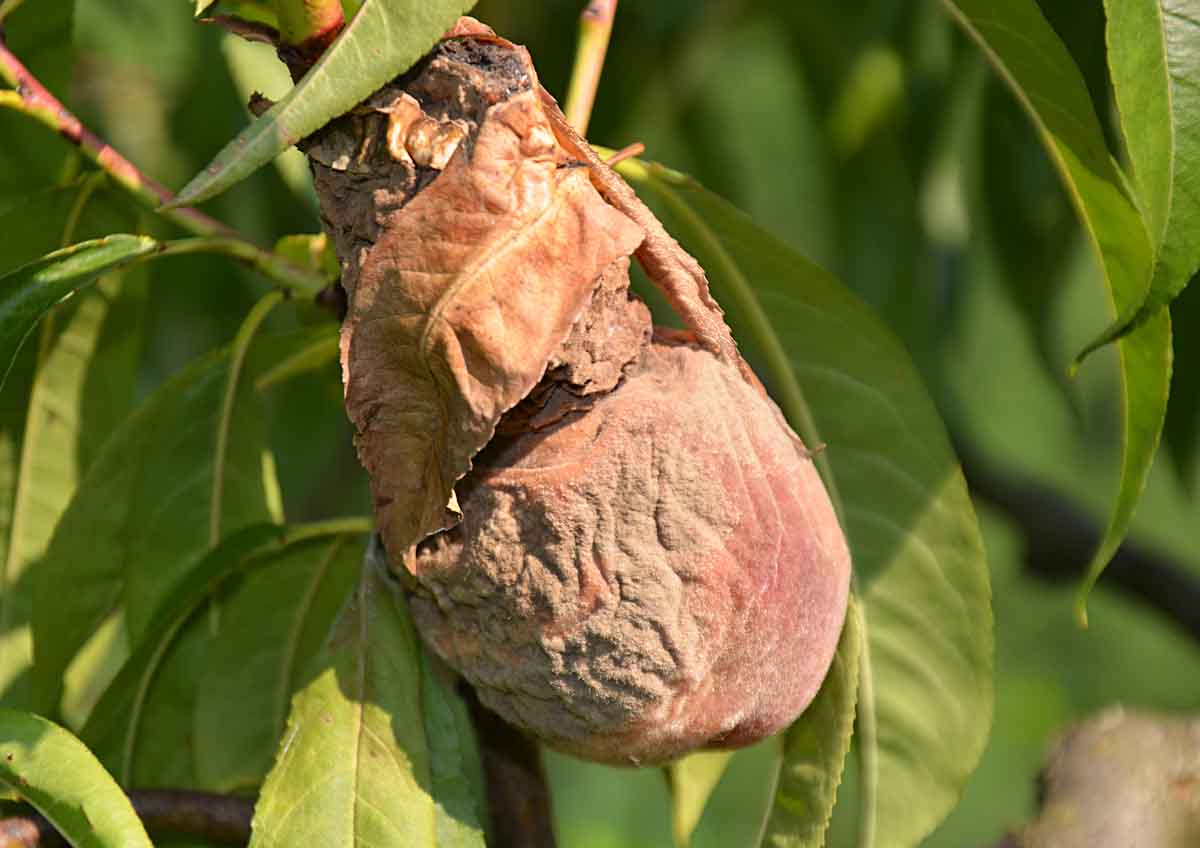 Moniliniová hniloba broskví - šedý porost původce Monilinia laxa