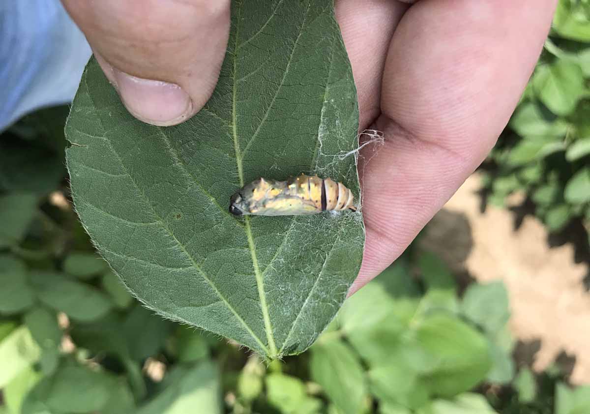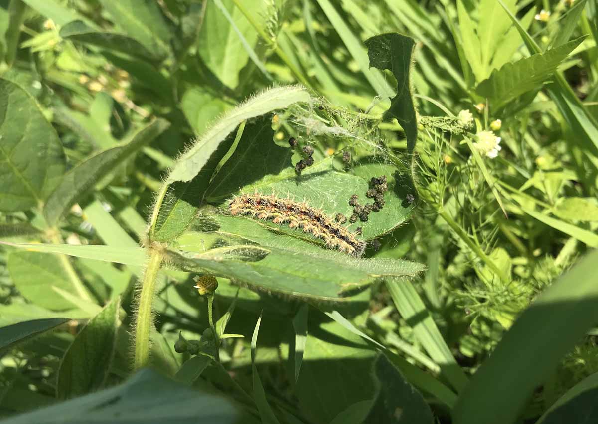 Obr. 6. Larva babôčky v hniezde, ktoré vytvorila z listov sóje