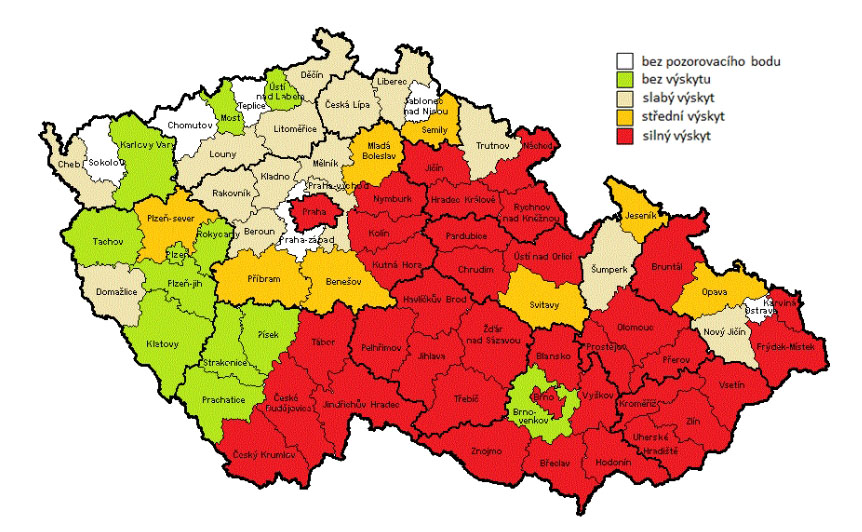 Mapa: Výskyt bázlivce kukuřičného v roce 2016 na území České republiky (zdroj: eagri.cz)