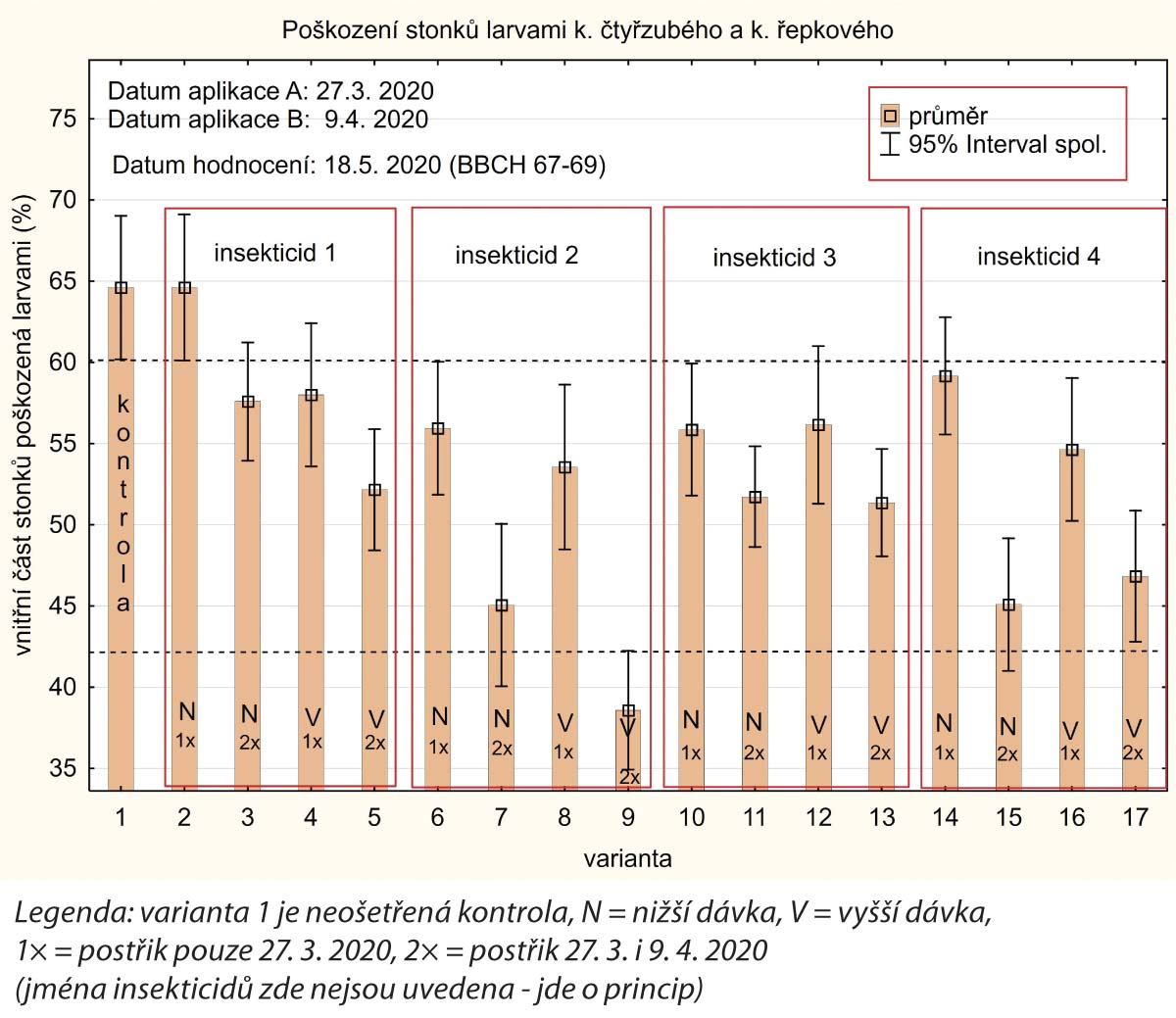 Graf 1: V sezonách, kdy je výskyt k. čtyřzubého a k. řepkového výrazně nad-prahový a doba kladení delší než 3 týdny, jedna aplikace insekticidu k dosažení uspokojivé ochrany stonků před poškozením larvami nestačí. Bez ohledu na termín postřiku i volbu insekticidu.