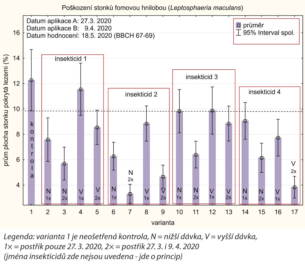 Graf 2b: Předejít rozvoji infekcí houbových chorob, konkrétně fomového černání stonku brukvovitých (Leptosphaeria maculans), v porostech, lze především dobrou ochranou proti škůdcům (jde hlavně o k. čtyřzubého). Dobře naplánované a provedené insekticidní aplikace jsou velmi účinným „fungicidem“.
