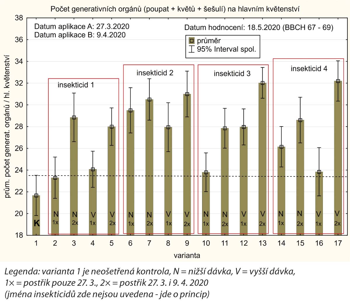 Graf 2a: Při vysokém výskytu a dlouhém období kladení krytonosců je účinnější aplikovat insekticid dvakrát po sobě s poměrně krátkým odstupem než jednou a ve vyšší dávce (nutno dodržet registrovanou dávku). Teprve když se aplikuje insekticid dvakrát, objeví se výrazné rozdíly v účinnosti mezi použitými přípravky. Pokud se za takových sezon, jako byla ta v roce 2020, ošetřil porost pouze jednou (zde 27. 3. 2020), bylo vcelku jedno, jaký insekticid byl použit. Pokud dvakrát, stalo se velmi podstatným, jestli byl použit insekticid 1, 3 nebo 2, 4. Na grafu lze také vidět, že i nejlepší varianty byly relativně dost poškozené (viz osa Y).