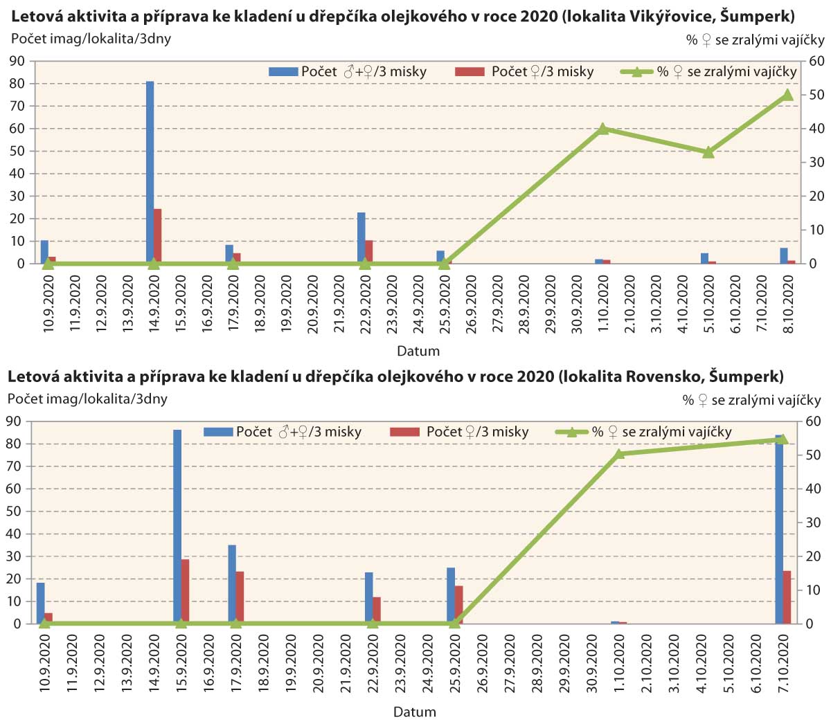 Graf 5a, b: Na podzim 2020 začal dřepčík olejkový klást vajíčka někdy od konce září. Přibližně 50 % samic schopných klást z populací přítomných v porostech bylo zaznamenáno v pastech v první dekádě října. Tedy v době, kdy pršelo a pršelo. Kdo by čekal, že se na poli něco děje, když prší.