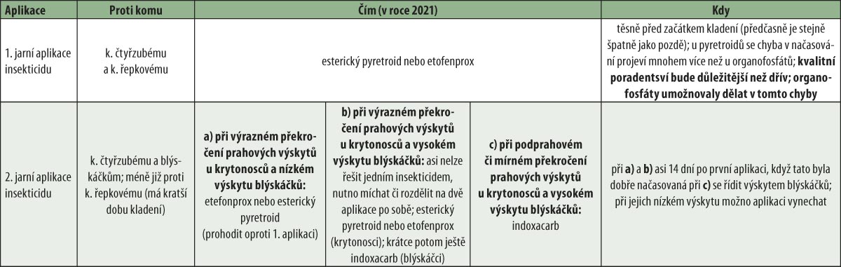 Tab. 2: Návrh na provedení insekticidních zásahů směřovaných proti stonkovým krytonoscům (k. čtyřzubý a k. řepkový) a blýskáčku řepkovému při zvážení všech úbýtků dostupných insekticidů, problémů s rezistencí i změn chování škůdců v důsledku vlivu měnících se meteorologických podmínek a s cílem dosáhnout uspokojivého výsledku dvěma postřiky