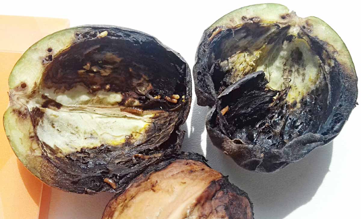 Larvy škodia vyžieraním oplodia, dôsledkom týchto poškodení a tiež aj infekcie baktériami a kvasinkami sa najprv vytvárajú hnedé neskôr čierne škvrny, postupne sčernie celý plod. Larvy nedokážu preniknúť cez škrupinu a tak jadro vo vnútri zostáva nepoškodené (na rozdiel od bakterióz, kde černie). Hniloba preniká aj k semenu. V prípade skorého napadnutia sú plody scvrknuté, mäkké a predčasne opadávajú.