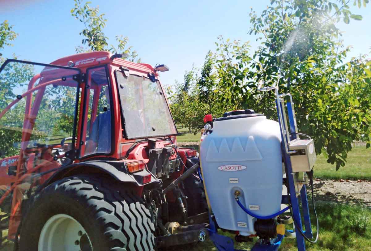 V roku 2020 sme v poloprevádzkových pokusoch v neprodukčnom orechovom sade (odrody Chendler a Lara) na juhu Slovenska pestovanom v integrovanej produkcii overovali a hodnotili účinnosť prípravkov povolených v Európe proti vrtivke orechovej. Neošetrenou kontrolou boli orechy vysadené popri príjazdovej ceste v blízkosti sadu. Charakteristiky použitých prípravkov sú dané v tab. 1. Použité prípravky, ich koncentrácie a dátumy aplikácie sa nachádzajú v tab. 2. Termíny aplikácie sme si zvolili na základe náletu múch na žlté lepové dosky. Tie sme nainštalovali do koruny stromov na začiatku júla. Lapače sme kontrolovali raz za týždeň (tab. 3, 4). Prípravky boli aplikované traktorovým postrekovačom Casotti - Doctor Fly. Je to profesionálny mikrodávkovací postrekovač s čerpadlom poháňaným kĺbovým hriadeľom a 120 l nádržou, ktorá sa fixuje v ráme za traktorom. Používa sa na stromovú aplikáciu vo vopred určených mikrodávkach, ktoré musia byť vždy rovnaké na každý strom. Ovládací monitor v kabíne traktora umožňuje určiť dávku, ktorá sa má rozdeliť s presnosťou na niekoľko ml na každý strom. Použité bolo 20 l postrekovej kvapaliny na 1 ha. Na každý strom bolo aplikované 2× 10 ml postrekovej kvapaliny. Obaja postreky sme zopakovali, lebo niekoľko hodín po aplikácii prišiel výdatný dážď.