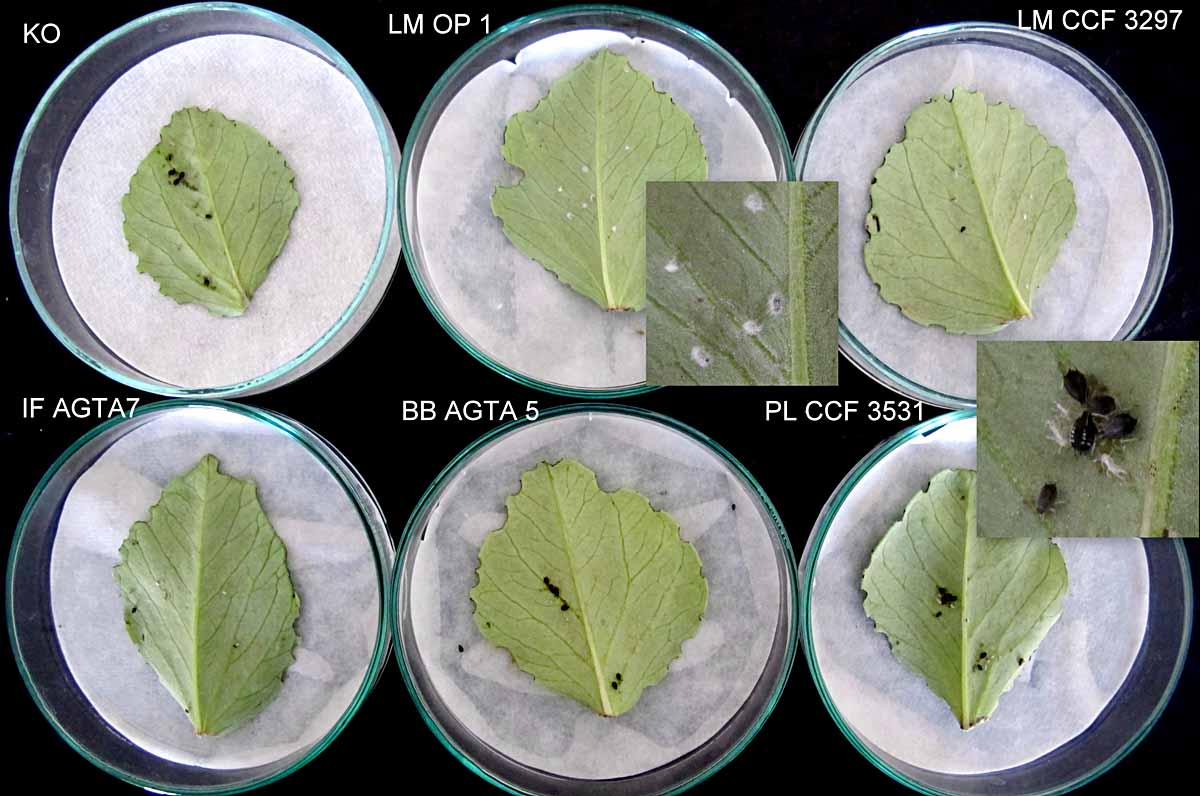 V laboratorních a následně i v polních podmínkách se zkoušela účinnost na mšici makovou. V laboratorních testech byly sporové suspenze 6 kmenů entomopatogenních hub získané z čistých kultur aplikovány na larvy a živorodé samičky mšice makové, které byly umístěny do vlhkých komůrek na listy bobu. Mšice byly odebrány z napadených rostlin bobu obecného na poli. Nejlepší účinnost na larvy byla zjištěna u kmenů hub L. muscarium, kdy druhý den po aplikaci dosahovala mortalita u kmene LM OP1 83,3 % a pátý den u obou kmenů L. muscarium 100 % (graf 1). Zcela neúčinný byl kmen P. lilacinum a málo účinný byl i kmen B. bassiana. Ve variantách ošetřených houbami Lecanicillium a Isaria se odumřelé larvy pokryly povlakem mycelia (obr. 1).