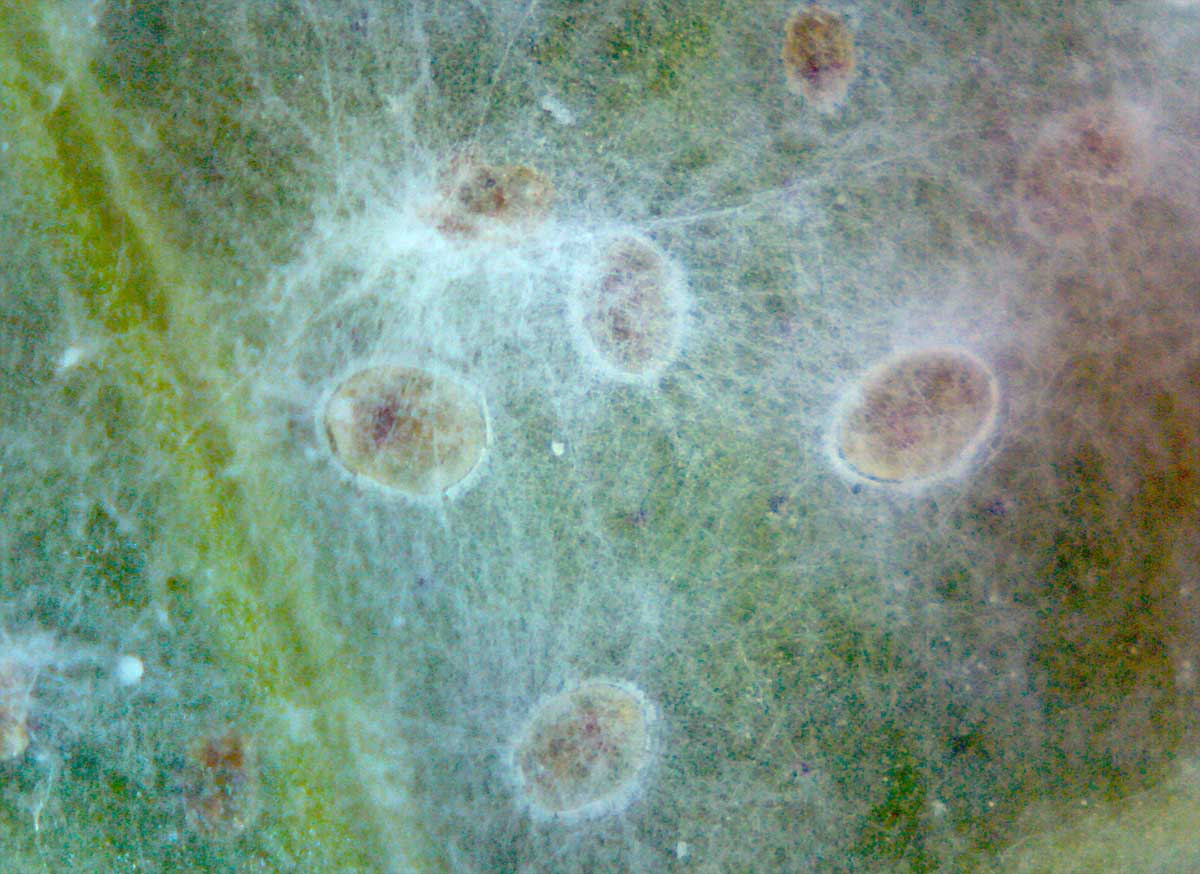 Obr. 4: Napadení puparií molice vlaštovičníkové houbou Lecanicillium muscarium