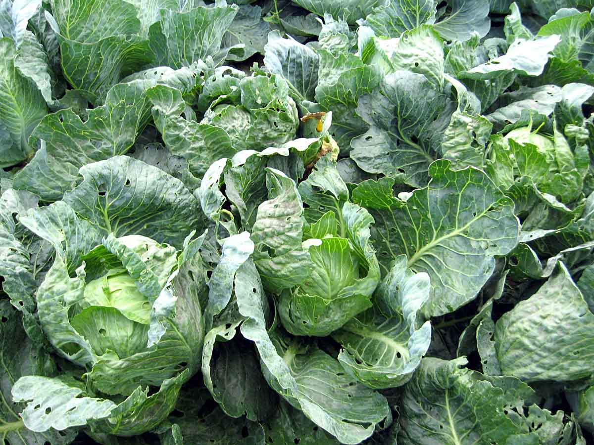 Obr. 2: Požerky housenek běláska zelného na listech růžičkové kapusty v kontrolní variantě