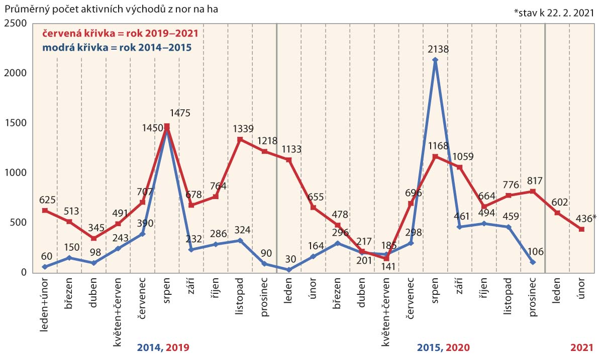 Celkově by se mohlo zdát, že současná situace je obdobná jako na konci zimy v letech 2019 a 2020 (graf 1) a že nám hraboší starosti nekončí. Na druhou stranu po letech máme za sebou pro hraboše relativně nepříznivou zimu, jejíž negativní dopad se na jeho celkový stav určitě promítne. Při pohledu na jednotlivé lokality s překročením 5násobku prahu škodlivosti v průběhu měsíců ledna a února 2021 (mapa 1) a jejich porovnání se stejným obdobím v roce 2020 (mapa 2) je celková situace mnohem příznivější. Ačkoli lze s největší pravděpodobností v průběhu března a dubna očekávat další pokles, popř. stagnaci stavu hrabošů na území ČR, další výskyt tohoto škůdce není možné podcenit. O celkové letošní situaci rozhodne především průběh června a července, resp. rychlost a načasování progradační fáze v gradačním cyklu hrabošů. Vzhledem k tomu, že se hraboš objevuje v krajině mozaikovitě, je nutné s lokálními přemnoženími i nadále počítat.