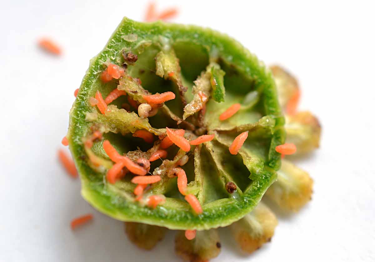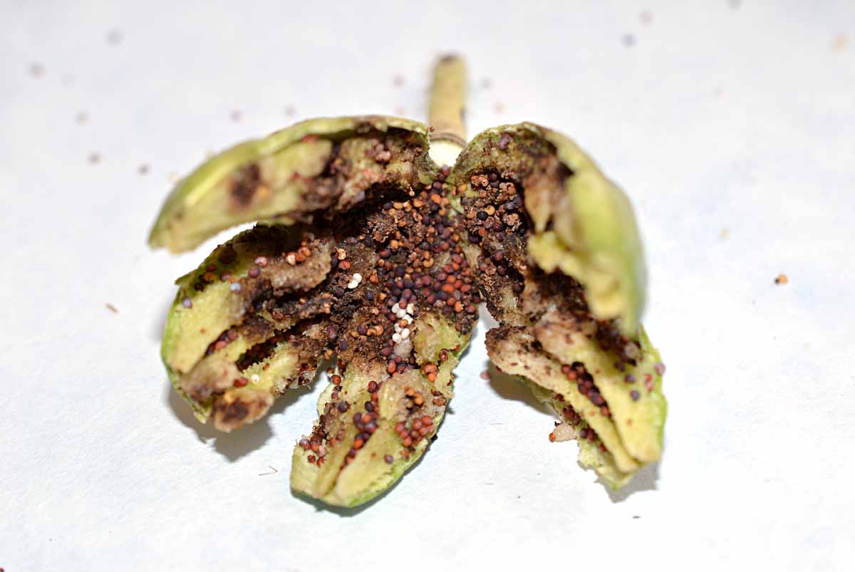 Obr. 3: Poškozená makovice s larvami krytonosce makovicového