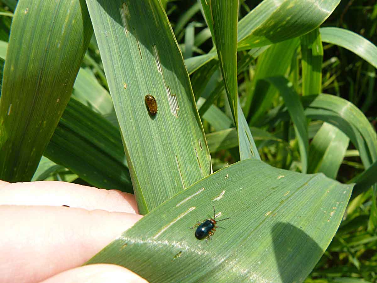 Obr. 5: Kalamitní výskyt larev kohoutků rodu Oulema v porostu