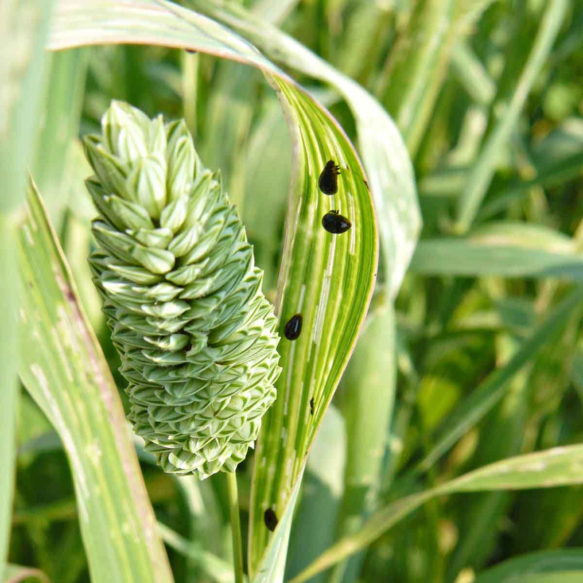 Pěstování lesknice kanárské pro semenářské využití vyžaduje v posledních letech zvýšenou pozornost. V porostech se začínají pravidelně vyskytovat hmyzí škůdci - především kohoutci rod Oulema, kteří při velmi vysokém výskytu svým žírem dokáží listy rostlin lesknice velmi vážně poškodit (obr. 5). Pravidelným monitoringem lze zjistit aktuální stav v porostu a použitím registrovaného insekticidu pak dojde k potlačení populace pod práh hospodářské škodlivosti.