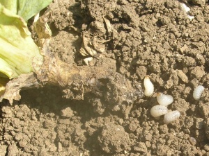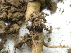 Obr. 3: Kořen máku napaden larvami krytonosce kořenového