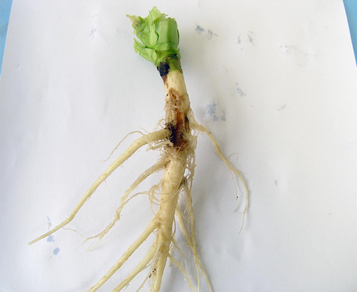 Obr. 4: Kořen řepky ozimé poškozený od larev květilky zelné