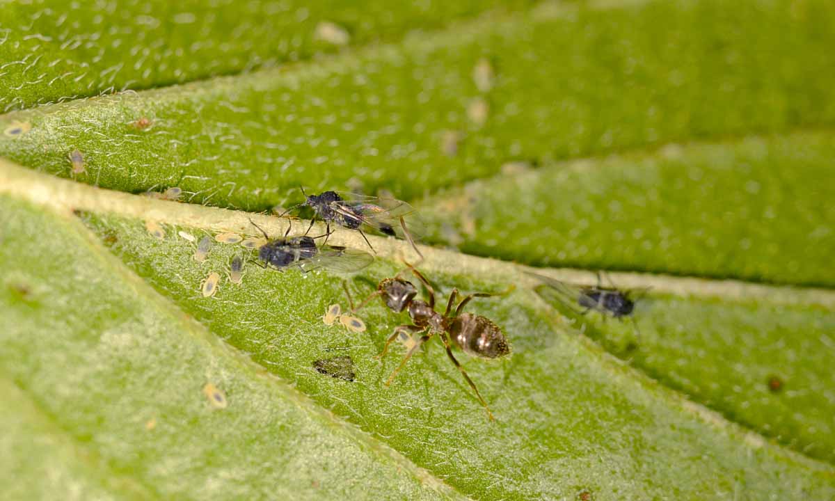 Obr. 2: Mšice maková (Aphis fabae) je známá jako jeden z největších polyfágů, nejrůznější plevelné rostliny na poli slouží jako rezervoáry tohoto škůdce