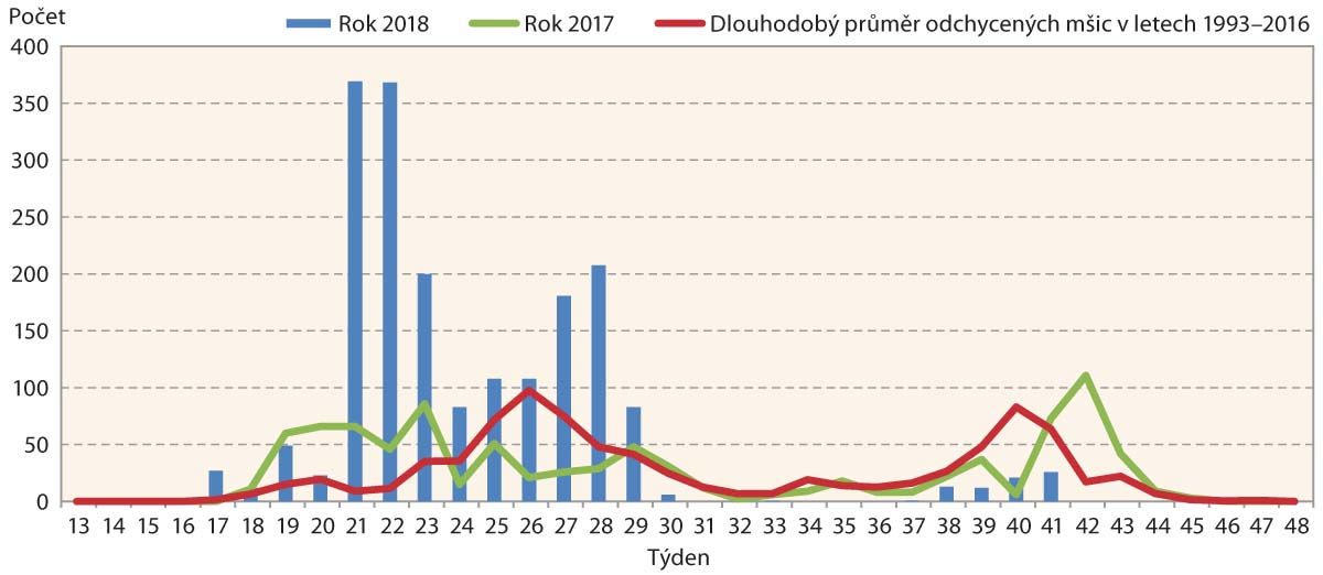 Jarní letová aktivita byla již od 18. týdne silně nadprůměrná, ale poté odchyty na dva týdny klesají a následně opět velmi silně rostou. Letošní jarní aktivita se v mnohém podobá té loňské než dlouhodobému průměru.