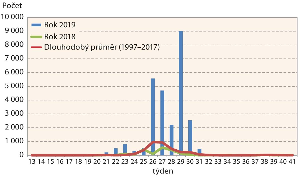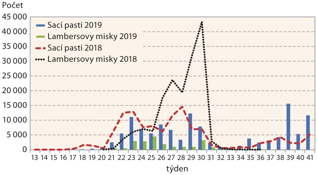 Graf 1: Letová aktivita mšic v sacích pastech a Lambersových miskách v České republice