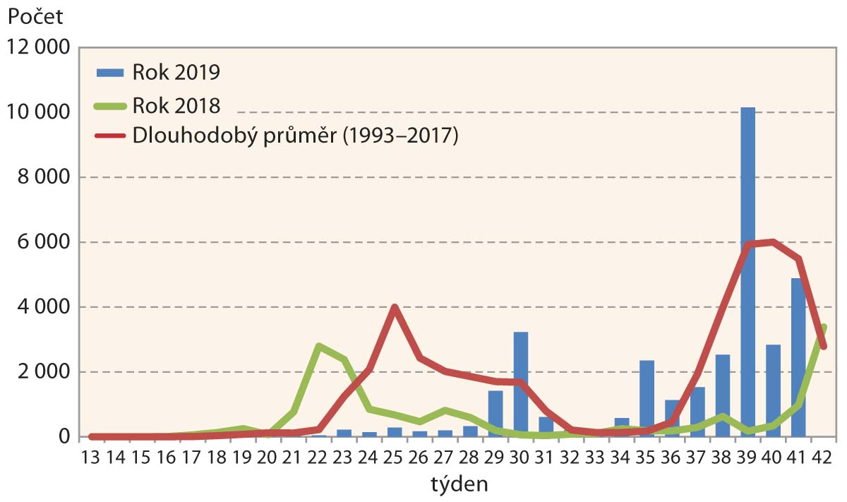 Podzimní letová vlna se zpočátku formovala dle dlouhodobého normálu a místy byla i nadprůměrná. Ovšem během 37.–38. týdne nenastal očekávaný nárůst záchytů, ale tato situace se změnila v 39. týdnu, kdy nastal dosud nejsilnější odchyt tohoto roku. Hodnoty byly natolik vysoké, že o cca 70 % překročily obvyklý vrchol letu. V dalším týdnu je výrazný pokles, ale ten je vystřídán jen dalšími extrémními hodnotami. Největší vliv na tento stav je nezvykle teplé podzimní počasí. Mšice měly v předešlých týdnech výrazně zhoršené podmínky k letu (velmi nízké teploty, silný vítr, časté deště nebo přeháňky atd.), a proto nastává hromadný přelet za vhodných podmínek.