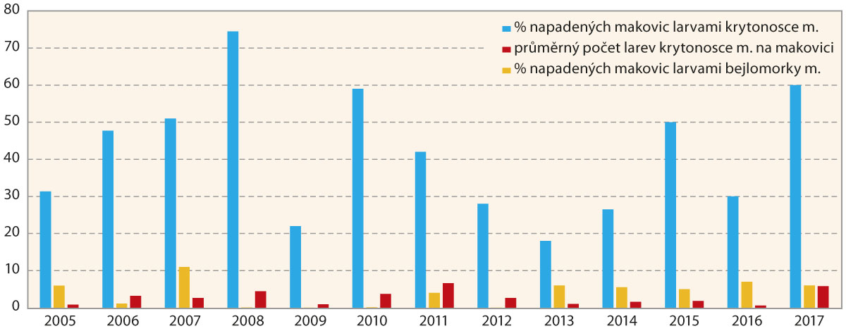 Prováděné polní pokusy ukazují ucelenou řadu výskytu makovicových škůdců v porostech, respektive v makovicích máku setého na lokalitě Troubsko v letech 2005 až 2017 (graf).
