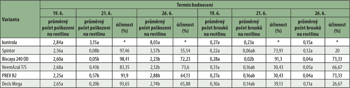 Zkoušeny byly následující insekticidní přípravky: Spintor (spinosad 240 g/l) v dávce 0,4 l/ha, NeemAzal T/S (azadirachtin A 10,6 g/l) v dávce 3 l/ha, Biscaya 240 OD (thiacloprid 240 g/l) v dávce 0,3 l/ha, Prev B2 (etahanolamin boritý odpovídající 2,1% vodorozpustnému bóru) a Decis Mega (delatmethrin 50 g/l) v dávce 0,15 kg/ha. Ošetření bylo provedeno v období háčkování až objevení se prvních květů.