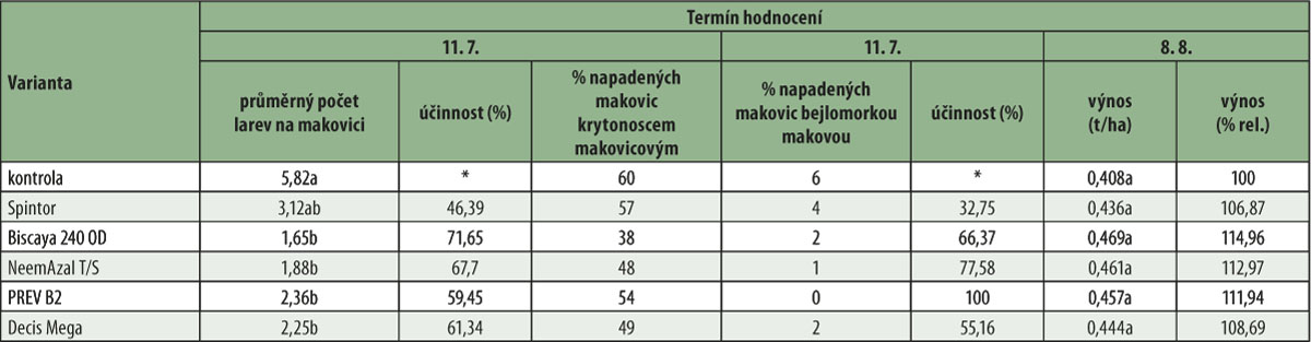 Při analyzování makovic na přítomnost larev krytonosce makovicového (tab. 2) bylo nejvyšší procento napadených makovic zjištěno na neošetřené kontrolní variantě dosahující v roce 2017 úrovně 60 %. Na neošetřené kontrolní variantě bylo rozborem makovic zaznamenáno v průměru 5,82 larev/makovici. Nejméně larev krytonosce makovicového bylo zaznamenáno u varianty s chemickým přípravkem Biscaya 240 OD (1,65 larev/makovici; biologická účinnost v porovnání s neošetřenou kontrolou - 71,65 %) a NeemAzal T/S (1,88 larev/makovici, biologická účinnost v porovnání s neošetřenou kontrolou - 67,7 %).