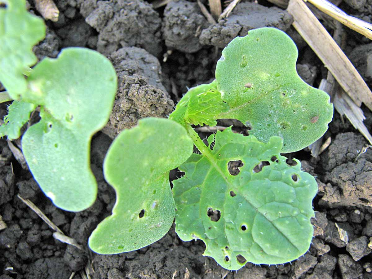 Obr. 1: Typické symptómy poškodenia rastliny repky ozimnej skočkami