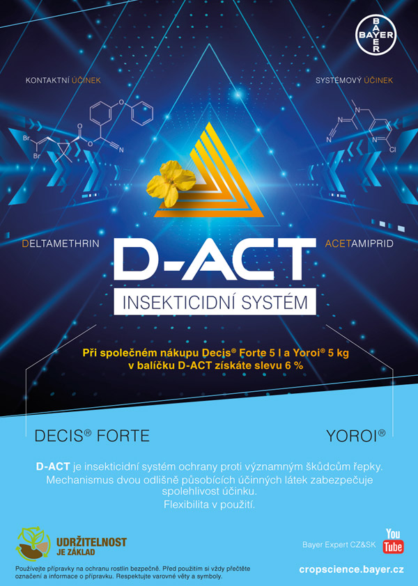 Firma Bayer přichází pro toto období s blokem insekticidní ochrany řepky pod názvem D-Act. Jedná se o nabídku ochrany řepky s využitím dvou přípravků - Decis Forte s vysoce koncentrovaným kontaktním deltametrinem a systémovým přípravkem Yoroi (acetamiprid). Tyto přípravky je možné využít v postřikovém sledu nebo případně i v kombinaci. Nacházejí široké uplatnění v systémech insekticidní ochrany řepky. Vzhledem k počtu povolených aplikací v řepce a široké registraci obou přípravků, je možné sestavit několik schémat jejich použití. Decis Forte je možné aplikovat 2× v průběhu vegetace a Yoroi až 3× s tím, že proti jednotlivým škůdcům je aplikován pouze 1× ( 1× stonkoví krytonosci, 1× blýskáček řepkový a 1× šešuloví škůdci). Dalším bonusem je, že oba přípravky jsou tolerantní vůči včelám.