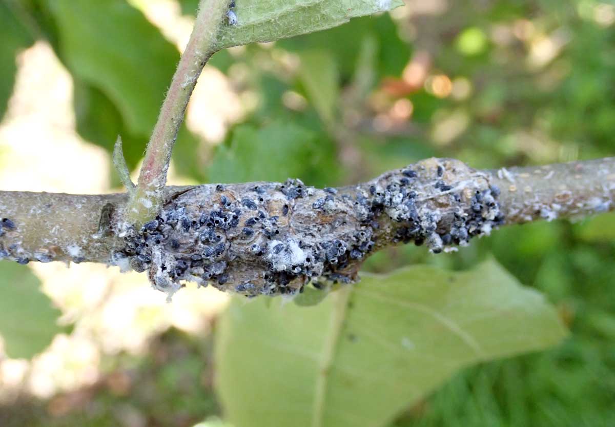 V rámci mšic tvoří samostatnou kapitolu tvoří vlnatka krvavá (Eriosoma lanigerum), která nachází vhodné podmínky pro rozvoj hlavně v bujněji rostoucích výsadbách a velmi dobře se jí daří pod sítěmi. Tato nepříjemná mšice s chutí obsazuje rány po řezech větších větví, takže třeba radikálnější zásahy při přechodu na tzv. řez „na klik“ mohou být pozvánkou právě pro tohoto škůdce. Ale jinak jsou principy ochrany stejné jako u ostatních mšic: systematický postup, zásahy co nejdříve, a hlavně rozumnou volbou přípravků šetřit přirozené nepřátele. Zde hraje úplně zásadní roli mšicovník vlnatkový (Aphelinus mali), který letos dokázal i silně napadené výsadby od kolonií vlnatky dokonale vyčistit. Mšicovník je ale citlivý na neonikotinoidy a organofosfáty, takže v přímé ochraně jsme odkázáni na osvědčený pirimicarb. Ten ovšem dlouhodoběji zanechává rezidua, takže později během sezony nemusí být pro mnohé pěstitele použitelný. Účinnost aficidních zásahů proti vlnatce výrazně podpoříme předchozí aplikací draselného mýdla schopného umýt ochranné voskové vrstvy mšic.