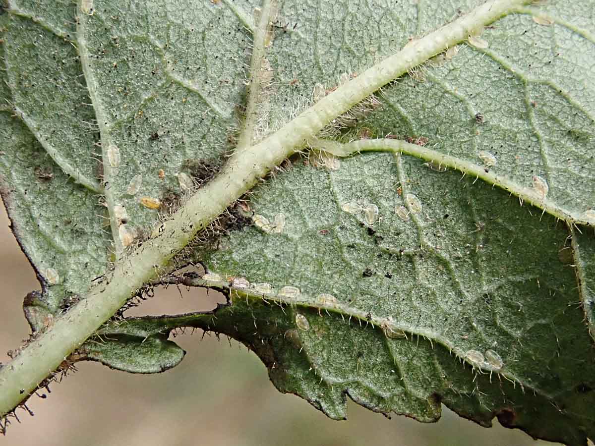 Kolonie vlnatky zdecimovaná parazitoidem Aphelinus mali