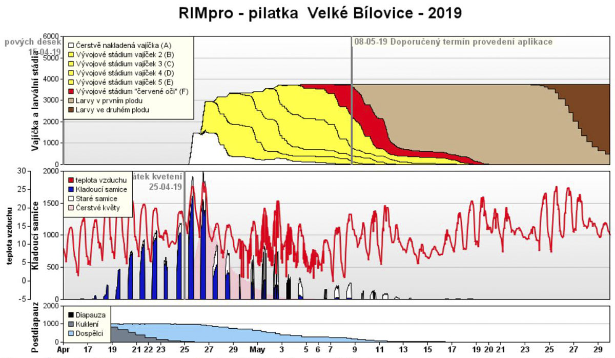 Graf 1: výstup programu RIMpro pro obaleče jablečného v roce 2019 (Velké Bílovice)