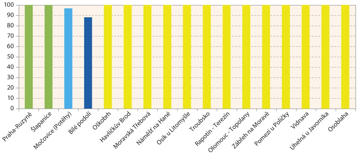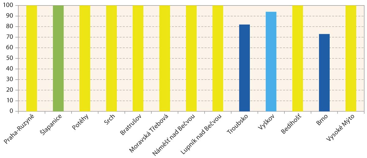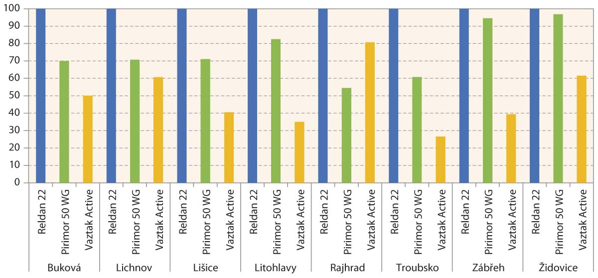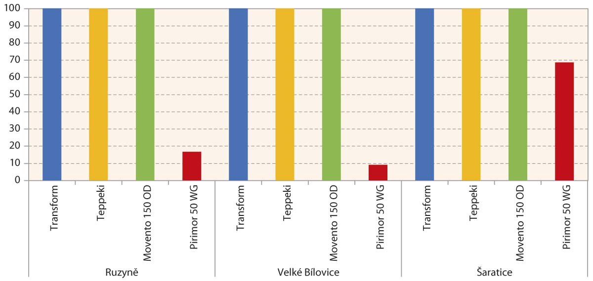 Plošný výskyt vysokého stupně rezistence vůči pyretroidům byl prokázán u mšice broskvoňové (obr. 2). V grafu 5 je ukázka výskytu rezistence mšice broskvoňové vůči přípravku Vaztak Active ze vzorků populací odebraných z řepky na podzim z celého území ČR. Všech 8 hodnocených populací bylo rezistentních nebo vysoce rezistentních vůči pyretroidu a 6 z nich bylo rezistentní také vůči karbamátu Pirimoru 50 WG. V grafu 6 je ukázka vysoké účinnosti nových přípravků s různým mechanizmem účinků Transform, Teppeki, Movento 150 OD na 3 populacích mšice broskvoňové ve srovnání s nedostatečnou účinností Pirimoru 50 WG.