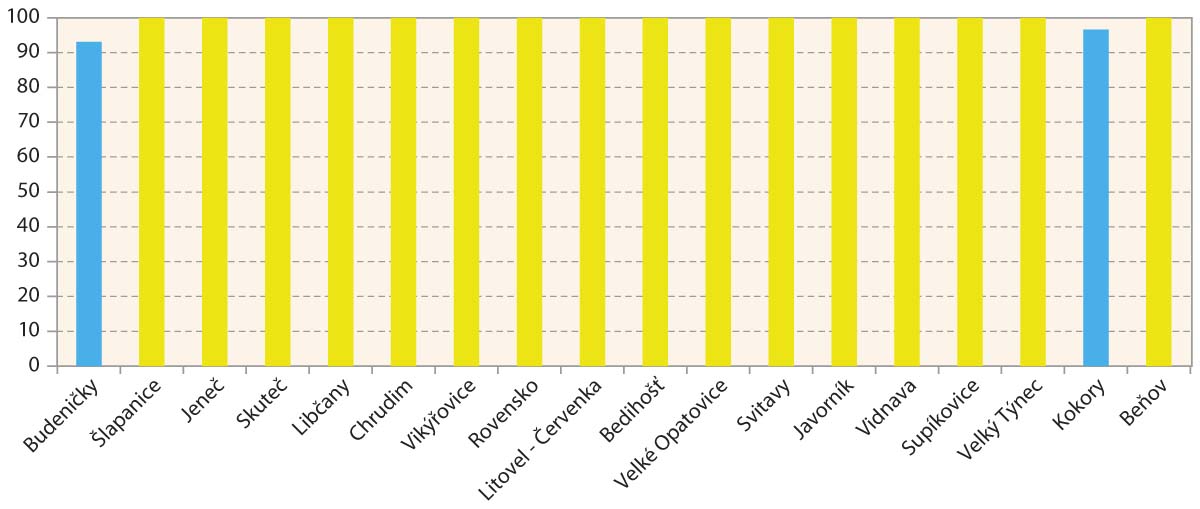 Graf 2: Účinnost pyretroidu lambda-cyhalothrin na dřepčíka olejkového po 100% polní dávce v roce 2019 (populace: zeleně - vysoce citlivá, žlutě - citlivá, světle modře - středně rezistentní, modře - rezistentní)