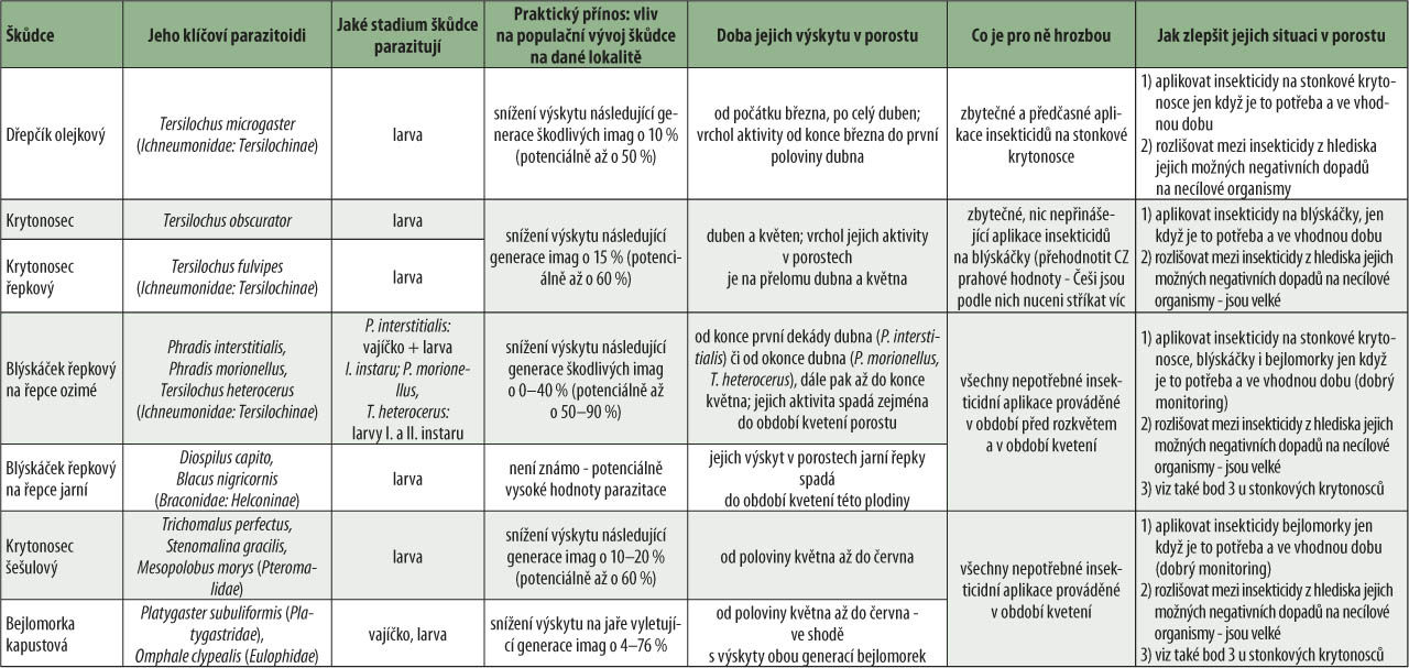 Tab. 1: Druhy blanokřídlých parazitoidů (Hymenoptera), které mohou výrazně přispět k dlouhodobé kontrole populační dynamiky důležitých řepkových škůdců - jinými slovy druhy, na které je vhodné brát v porostech ohled