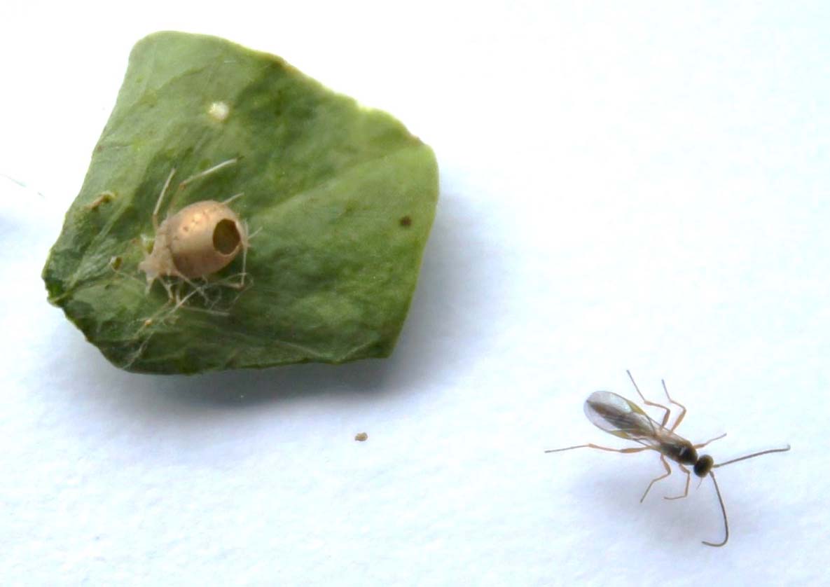 Obr. 4: Lumčík líhnoucí se z insekticidně ošetřené mumie kyjatky hrachové