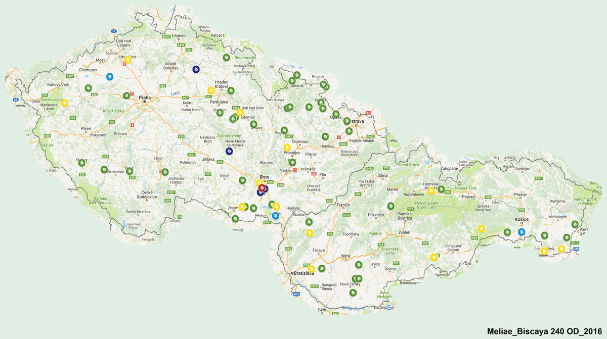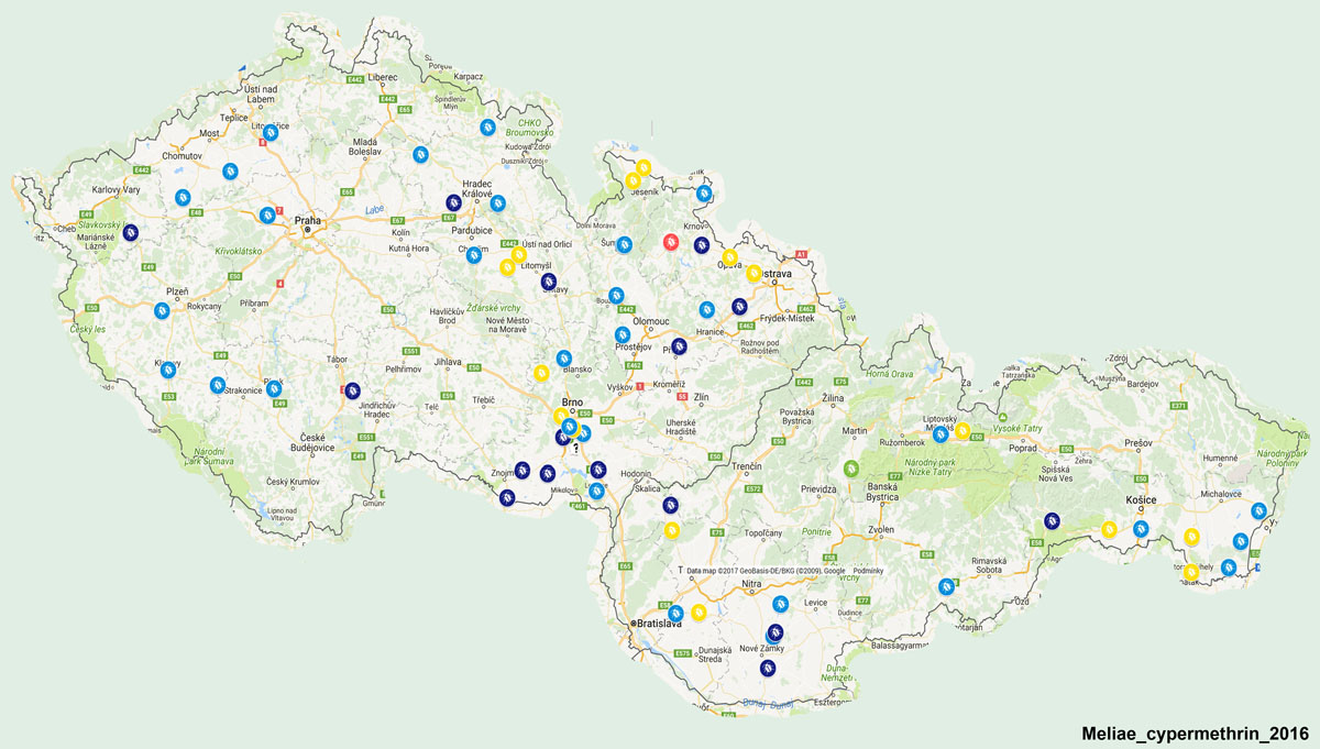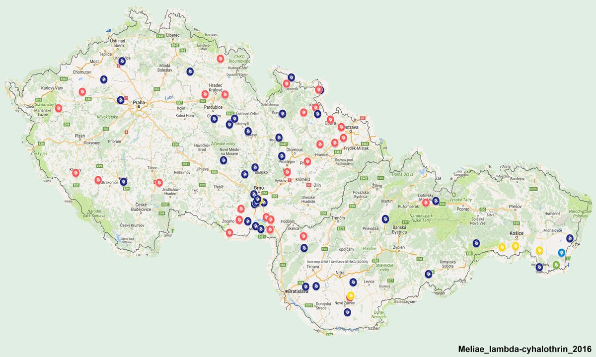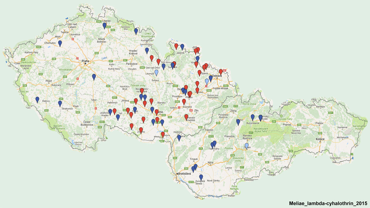 Mapa 1: Disperze populací blýskáčků vykazujících určitý stupeň rezistence nebo citlivosti k esterickému pyretroidu lambda-cyhalothrin na území ČR a SK v roce 2015; Legenda: zelené body = vysoce citlivá populace (st. 1); žluté body = citlivá populace (st. 2); světle modré body = středně rezistentní populace (st. 3); tmavě modré body = rezistentní populace (st. 4); červené body = vysoce rezistentní populace (st. 5)
