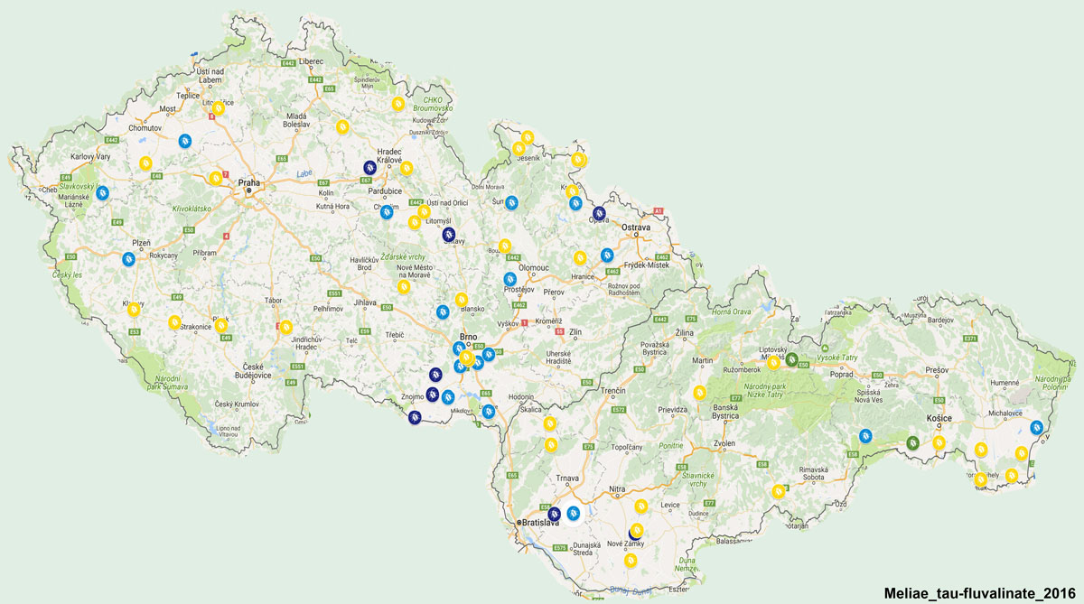 Mapa 4: Disperze populací blýskáčků vykazujících určitý stupeň rezistence nebo citlivosti k pyretroidu tau-fluvalinate na území ČR a SK v roce 2016 (barvy bodů viz mapa 1)